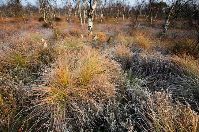 Het wordt vaak gezegd, in Nederland bestaat geen echte natuur meer. Het ligt eraan hoe je dat definieert of ervaart, maar het klopt dat er weinig plekken zijn, waar de mens niet een doorslaggevende rol heeft gespeeld in de ontwikkeling van het landschap. Maar toch is het mogelijk om ook buiten grote gebieden als de Waddenzee en de Veluwe een gevoel te krijgen van ongereptheid. Dit gevoel had ik heel sterk toen ik me op het Witterveld bevond temidden van het enige intacte hoogveen-berkenbroekbos van Nederland. Oninteressant voor bosbouw, verevening, of andere activiteiten is hier een pareltje ontstaan onder de rook van het TT-circuit en naast grootschalig afgegraven veengebieden. Op een nevelige koude morgen heeft de rijp de alles onder een kristallen deken bedekt. De berken die hier groeien zijn niet hoger dan een meter of vier, maar zijn al vele tientallen jaren oud. Ik waan me in Zweden.